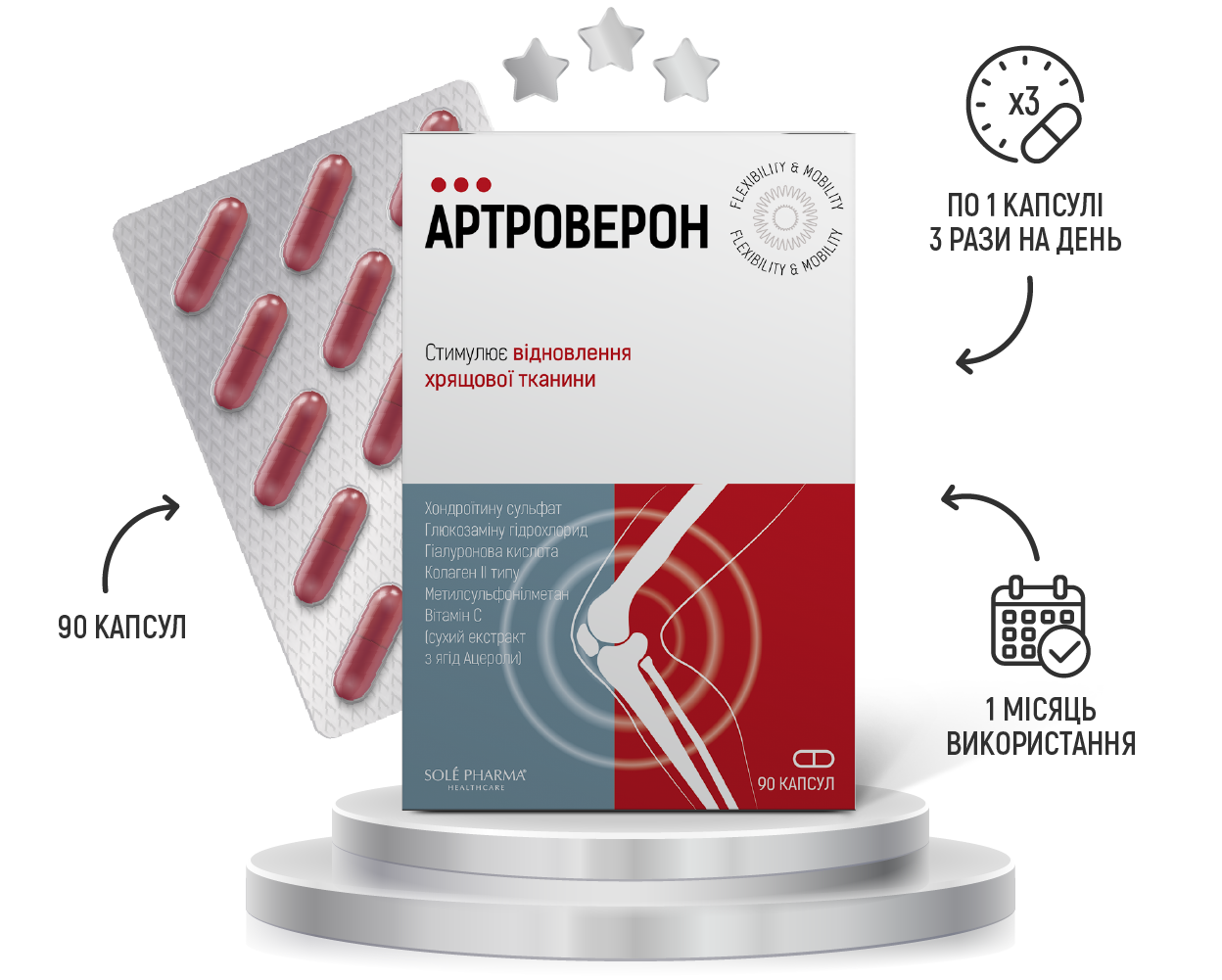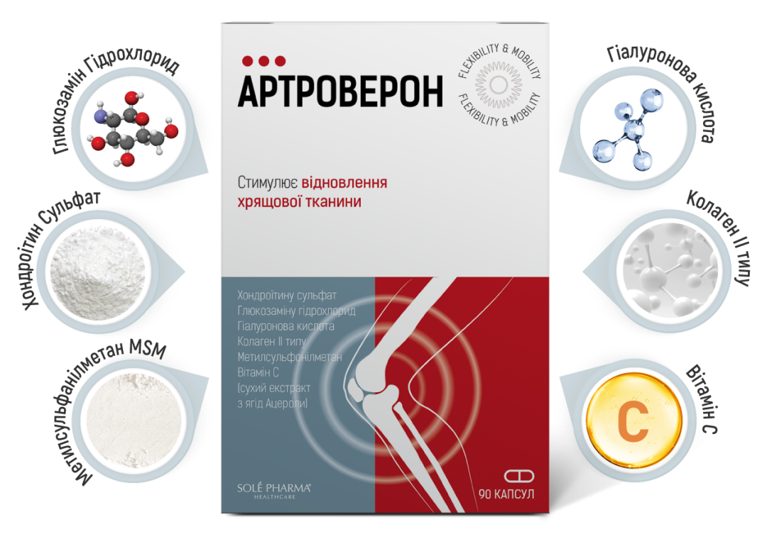Артроверон – це не просто глюкозамін, це комплексна композиція інгредієнтів, які мають доведену cинергічну дію на суглоби як хондропротектори. Потужні інгредієнти, поєднані разом, покращують активність один одного, забезпечуючи структурну та функціональну підтримку суглобів і сполучної тканини.
